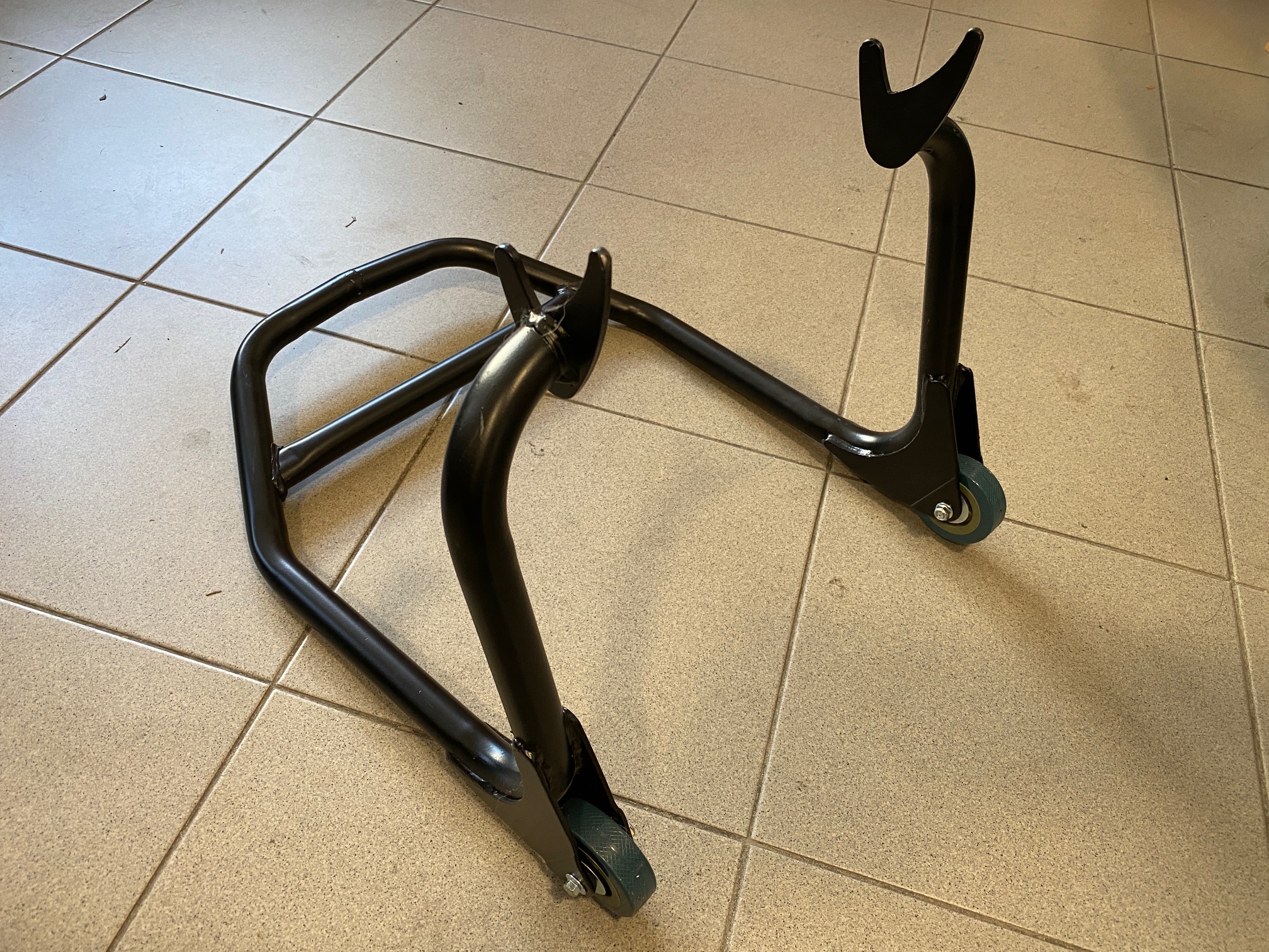 Bei Verwendung entsprechender Achsprotektoren kann der Ständer auch dazu werden, das Vorderrad anzuheben.